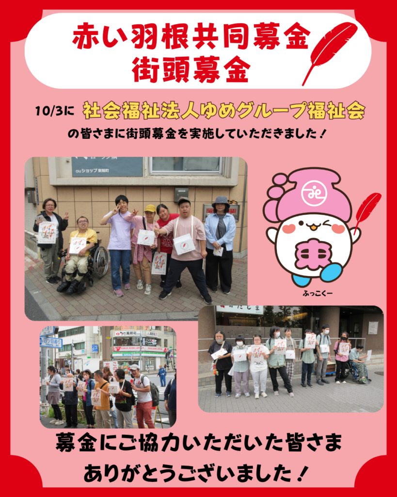 10月3日赤い羽根共同募金をしました。東陽公園で集まって募金箱持って、歩いて、「赤い羽根共同募金ご協力お願いします!」を言いました。緊張は、したけど、皆がいたからできました。また行こうと思います。楽しかったです。ご協力ありがとうございました。 あや